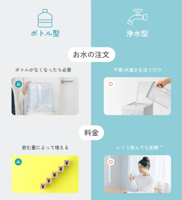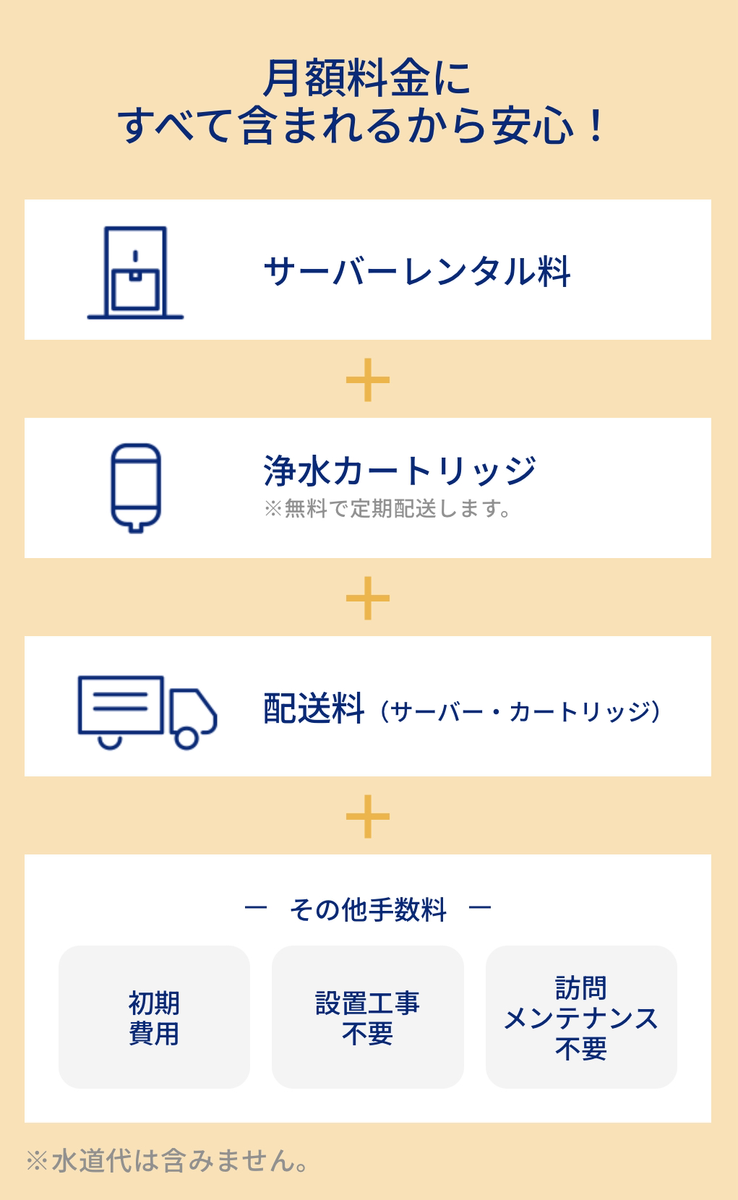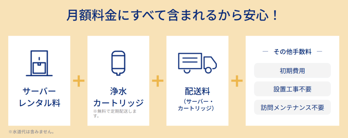 ボトル型ウォーターサーバーは、サーバーのレンタル料金にプラスしてボトル代(水代)がかかりますが、浄水型ウォーターサーバーは水道水を注ぐだけなので追加料金は一切なし!いくら飲んでも、ずっと定額で利用できます。今回紹介した7社の場合、浄水フィルターの交換費用も月額に含まれています。