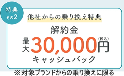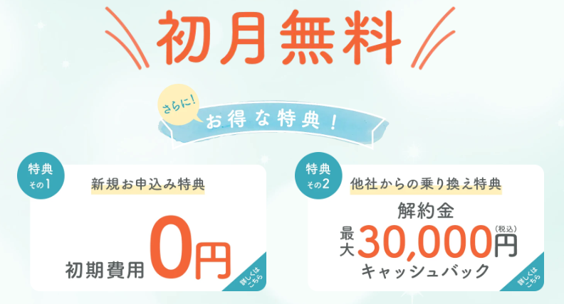 新規申し込みの場合は初月無料!他社から乗り換える場合は、最大30,000円がキャッシュバックされます。検討中の方は、キャンペーン中に申し込むとお得ですよ。