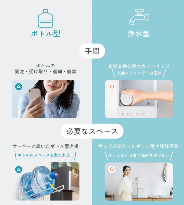 ボトル注文・交換の手間がないのも、浄水型ウォーターサーバーのメリット。重いボトルを運んだり、サーバーにセットしたりする面倒がありません。ボトルを置いておくスペースがなくても安心。