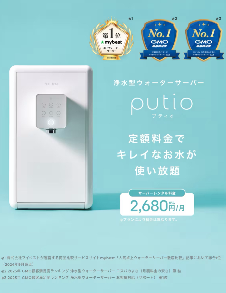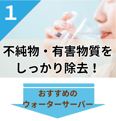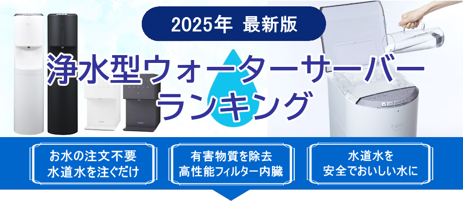 | おすすめ ポイント | 除去物質数No.1! 浄水フィルターの交換も年1回のみ&無料。細かく温度調節でき、コーヒー抽出機能付きモデルがあるのも魅力。どこを取っても文句なし! | 高性能&低コストの床置きサーバーを探している人におすすめ。除去物質数は平均的でもPFASはしっかり除去。1日最大7L浄水可能なので家族や水を沢山使う人向き。 | 卓上サーバーの安さNo.1!温度調節などの機能を求めず、コスパ・省スペースを重視する人におすすめ。エコモードで電気代も節約可能。 | シンプルな黒・白のほかにピンク・パープル・グリーンの3色も。部屋の雰囲気に合わせたい人におすすめ。 | クリクラの浄水型ウォーターサーバー。幅24cmのコンパクトボディ。年に1回サーバーごと無料で交換できるのも魅力。 |